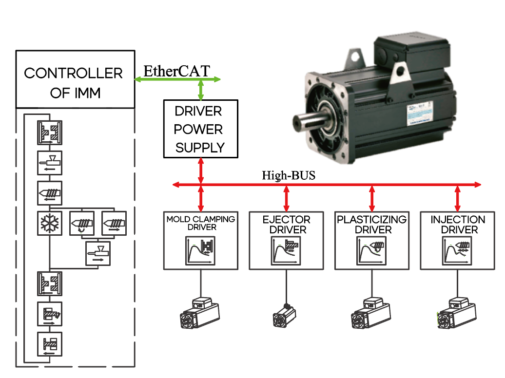 - Servo motor controls injection, plasticizing, and clamping independently, allowing faster feedback, more responsive control, and improved control accuracy;