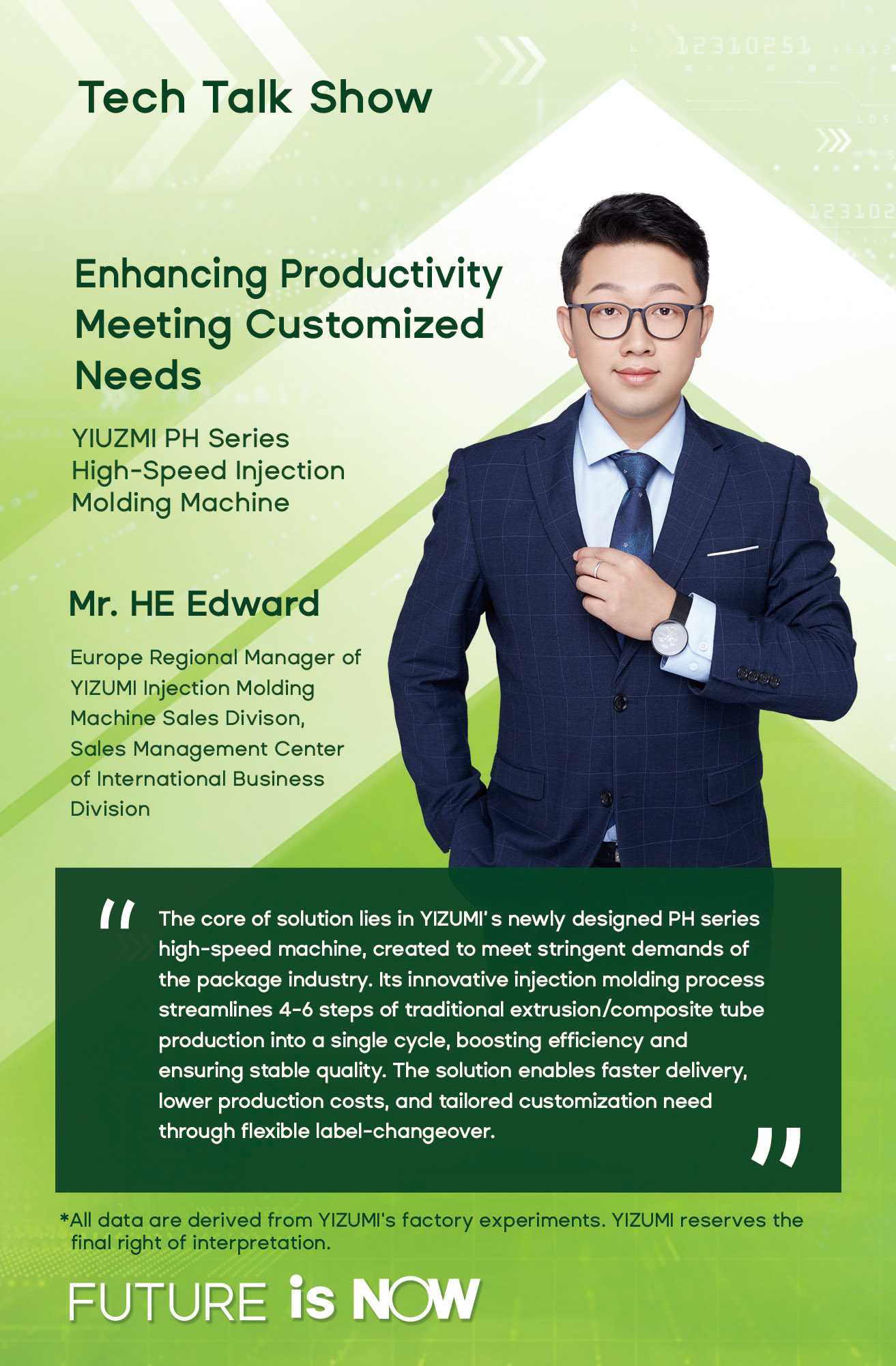 The core of solution lies in YIZUMI’s newly designed PH series high-speed machine, created to meet stringent demands of the package industry. Its innovative injection molding process streamlines 4-6 steps of traditional extrusion/composite tube production into a single cycle, boosting efficiency and ensuring stable quality. The solution enables faster delivery, lower production costs, and tailored customization need through flexible label-changeover.