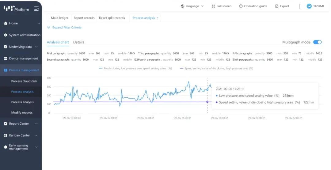 Yi+ Intelligent Manufacturing Platform's new feature, process transplantation, is independently developed by YIZUMI and specifically designed for injection molding manufacturers. It integrates process control and can upload and distribute process files to high-end intelligent injection molding equipment and auxiliary machines with one click, achieving intelligent process management.
