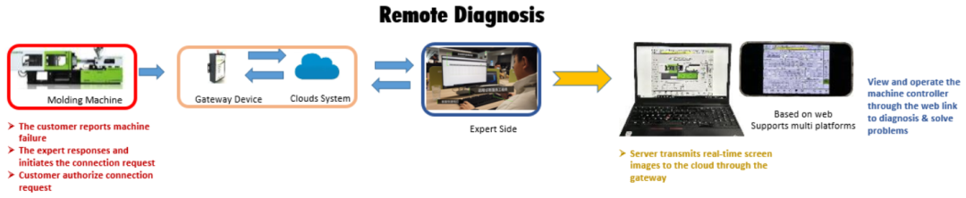 Remote diagnosis focuses on after-sales service, remote adjustment, and fault diagnosis of molding equipment. Based on remote diagnosis systems, it can solve common equipment problems, improve service efficiency, reduce service costs, and empower customers with comprehensive equipment management.