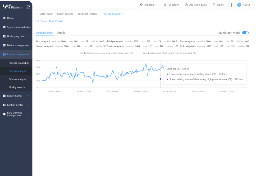Yi+Intelligent Manufacturing Platform's new feature process transplantation is independently developed by YIZUMI and specifically designed for injection molding production and manufacturing enterprises. It integrates process control and can upload and distribute process files to high-end intelligent injection molding equipment and surrounding auxiliary machines with one click, achieving intelligent process management.
