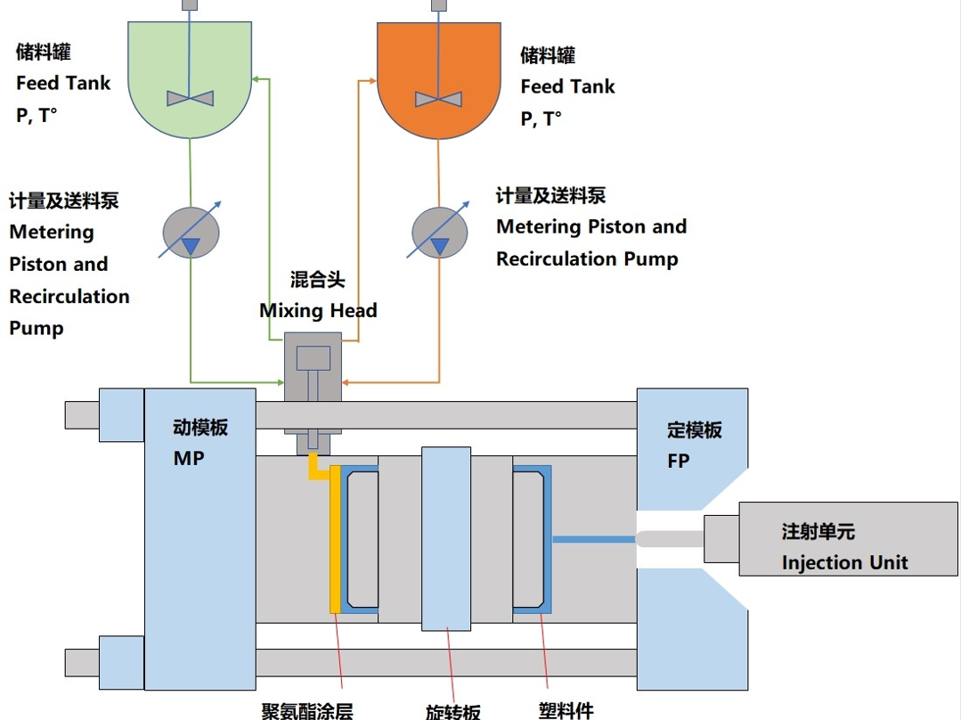 ReactPro一步法實現注塑和聚氨酯包覆成型技術的結合,并搭載水平轉盤模具技術,以”一步成型“工藝替換傳統表面噴涂工藝。將注塑模具、聚氨酯模具安裝在注塑機上,聚氨酯反應設備的PU混合頭安裝在注塑機的PU模具上。