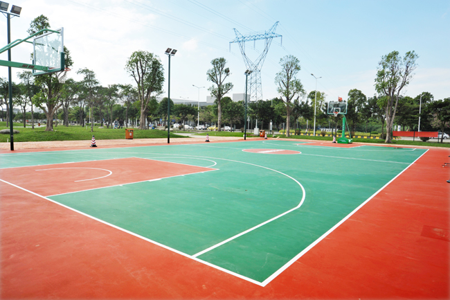 籃球場采用硅PU面層專業運動地面,上硬下彈,具有良好的反彈作用;其優質的彈性為運動員提供有效的緩沖吸收和減震保護;移動單臂籃球架,高強度安全玻璃籃板,為國家標準高強度安全鋼化玻璃材料制成,完全勝任大型賽制及灌籃等激烈運動。