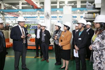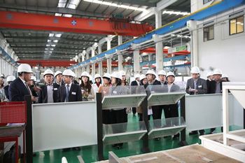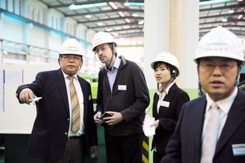 伊之密董事總經(jīng)理甄榮輝(左二)陪同媒體伊之密董事總經(jīng)理甄榮輝(右二)陪同媒體朋友參觀注塑機車間