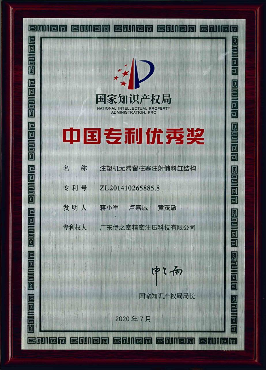 據統計,2020年伊之密申請專利83項,其中發明專利28項;獲得授權專利41項。其中“注塑機無滯留柱塞注射儲料缸結構”獲中國專利優秀獎。這是伊之密繼半固態鎂合金注射成型技術獲得第19屆中國專利優秀獎后,2020年在第21屆中國專利獎再獲該項專利榮譽。伊之密專利名錄再添一張“國家級名片”!