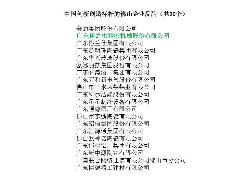 9月9日,伊之密在第七屆“品牌佛山”活動中,榮獲“中國創新創造標桿的佛山企業品牌”稱號,一同獲得該稱號的還有美的、萬和電氣、蒙娜麗莎、格蘭仕等企業。