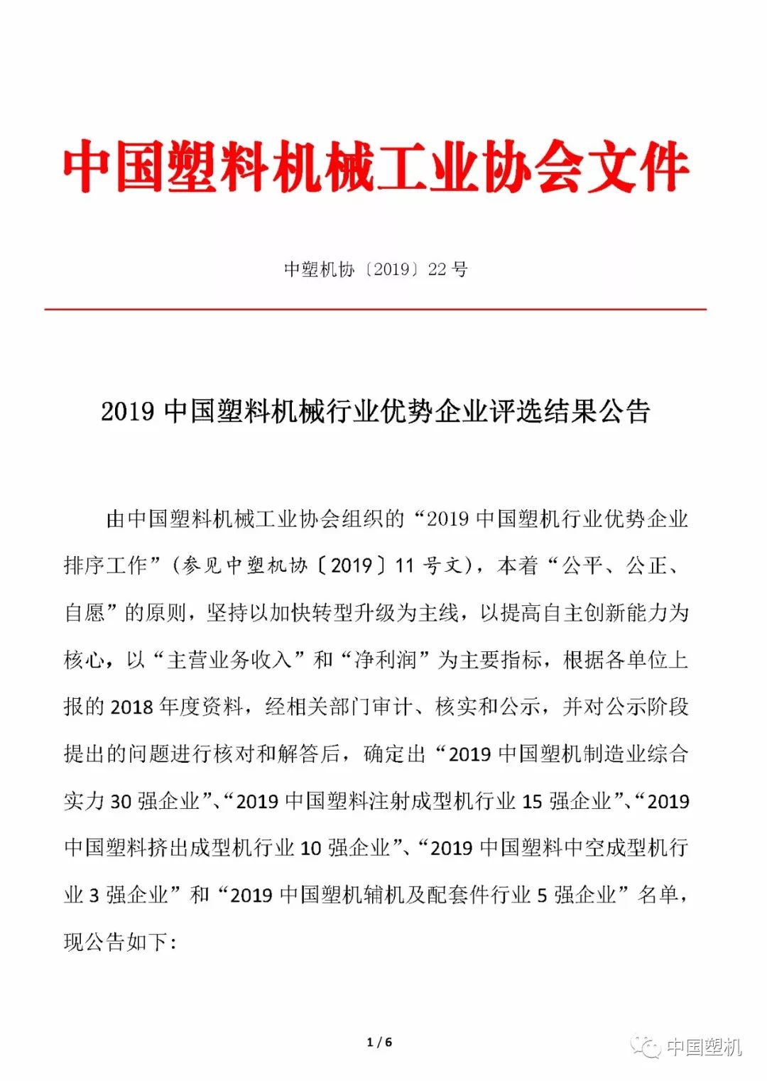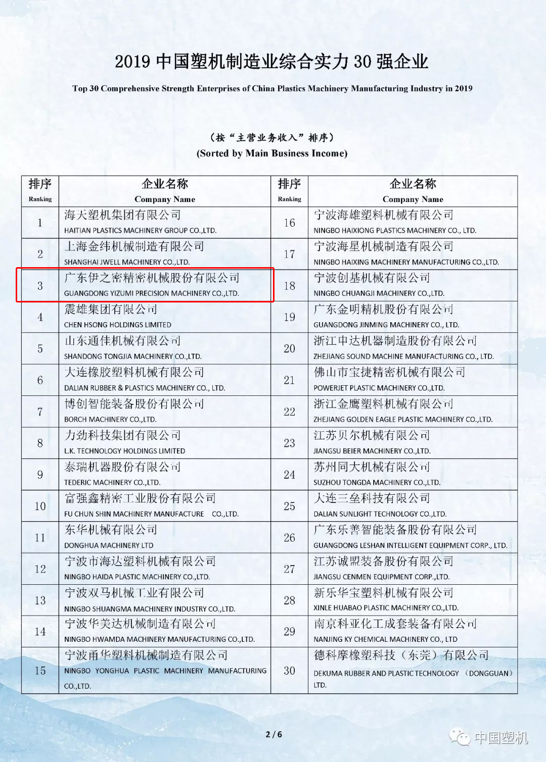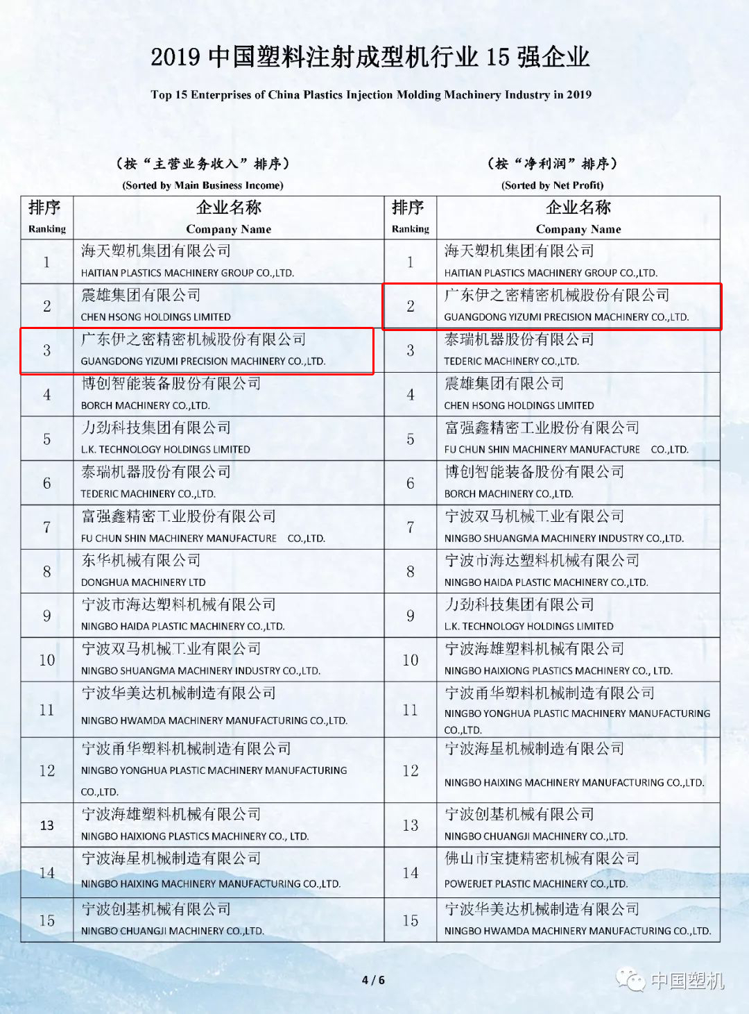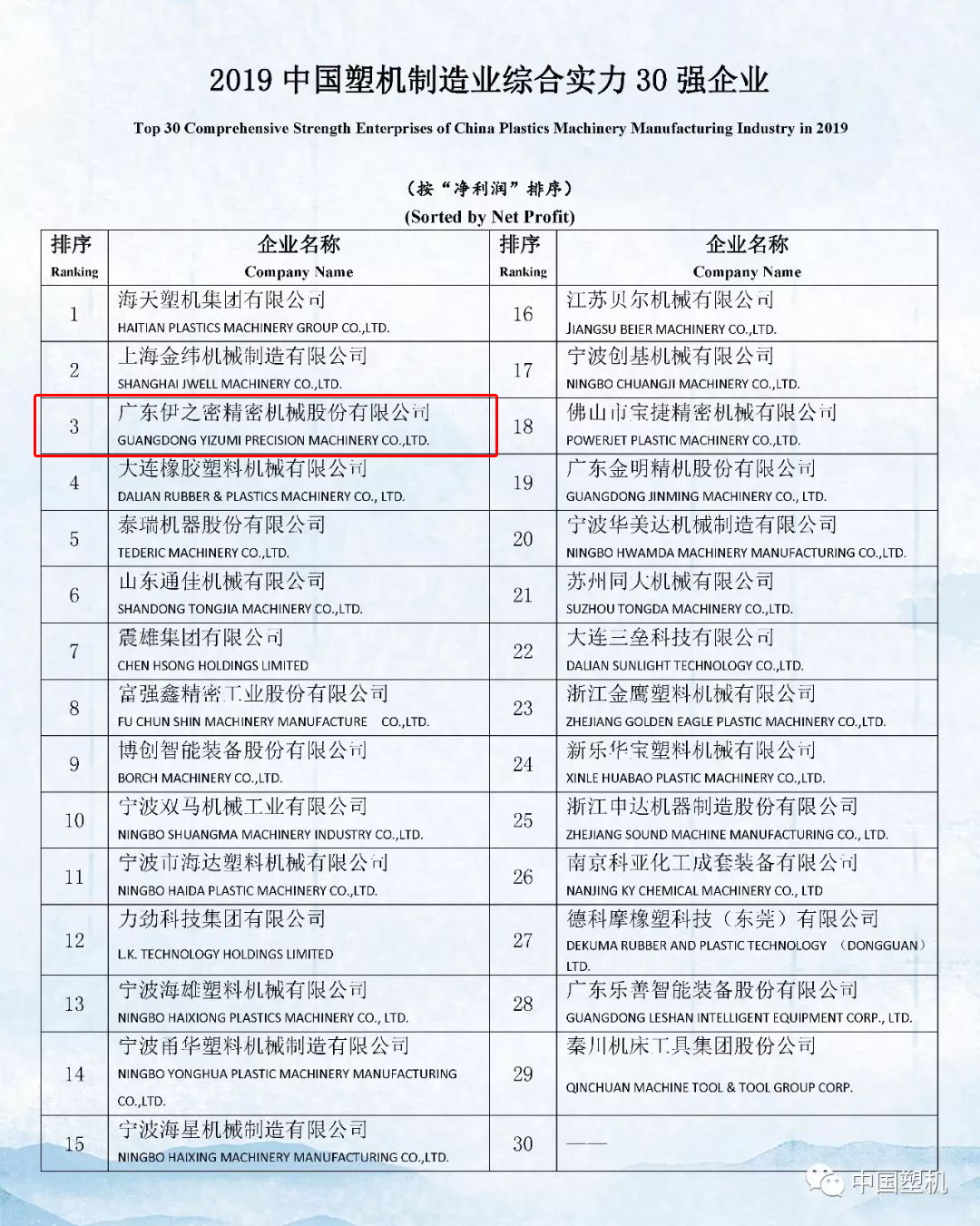 今日,中國塑料機械工業協會公布2019中國塑料機械行業優勢企業評選結果,伊之密“主營業務收入”和“凈利潤”均居“2019中國塑機制造業綜合實力30強企業”、“2019中國塑料注射成型機行業15強企業”前三。