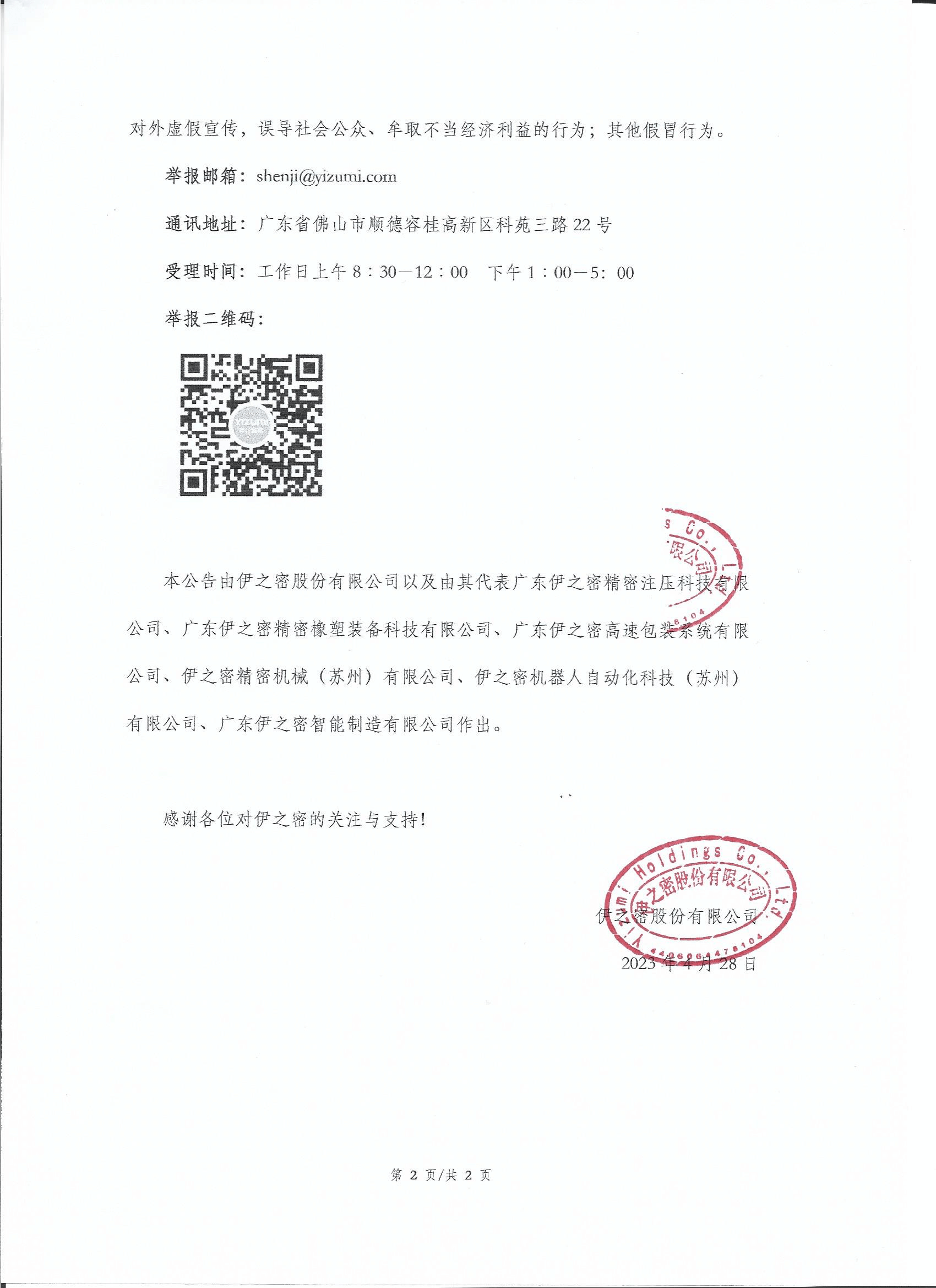 本公告由伊之密股份有限公司以及由其代表廣東伊之密精密注壓科技有限公司、廣東伊之密精密橡塑裝備科技有限公司、廣東伊之密高速包裝系統(tǒng)有限公司、伊之密精密機(jī)械(蘇州)有限公司、伊之密機(jī)器人自動(dòng)化科技(蘇州)有限公司、廣東伊之密智能制造有限公司作出。