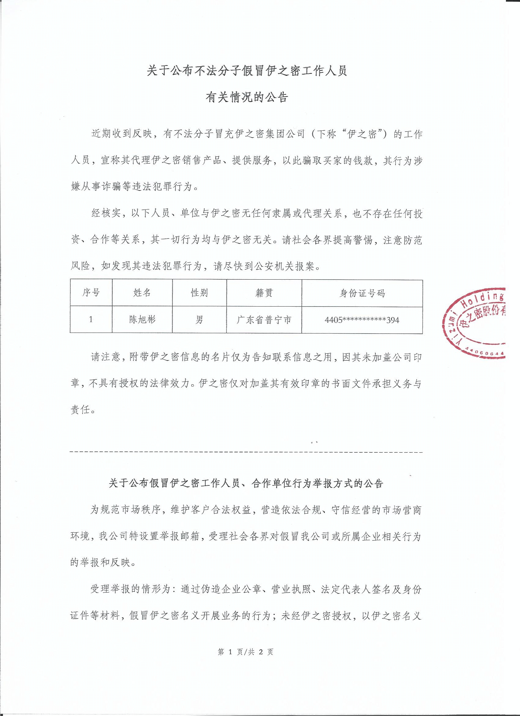 關(guān)于公布不法分子假冒伊之密工作人員 有關(guān)情況的公告