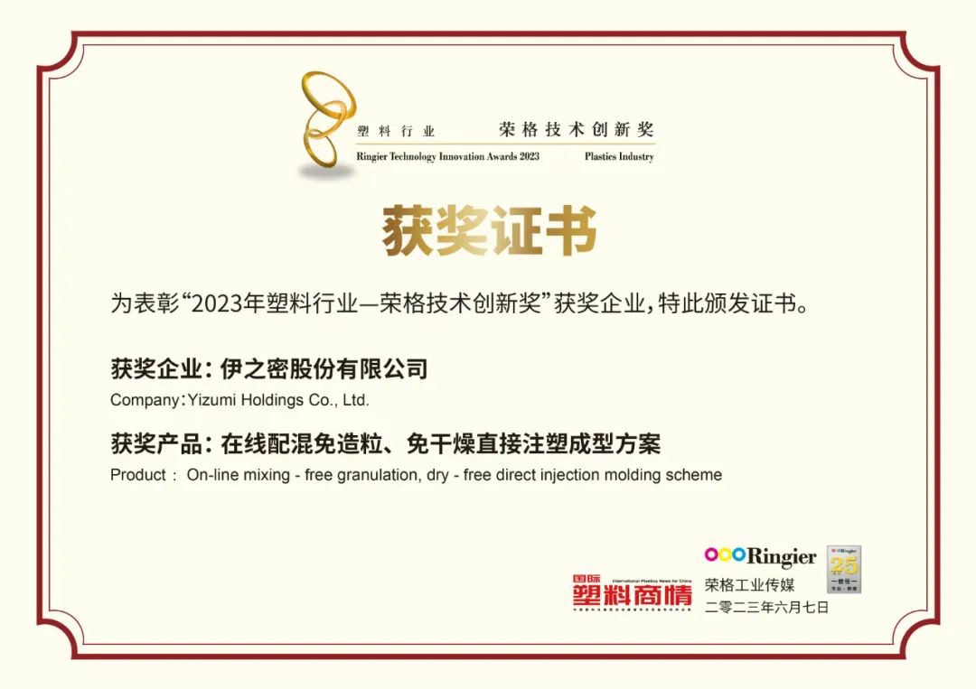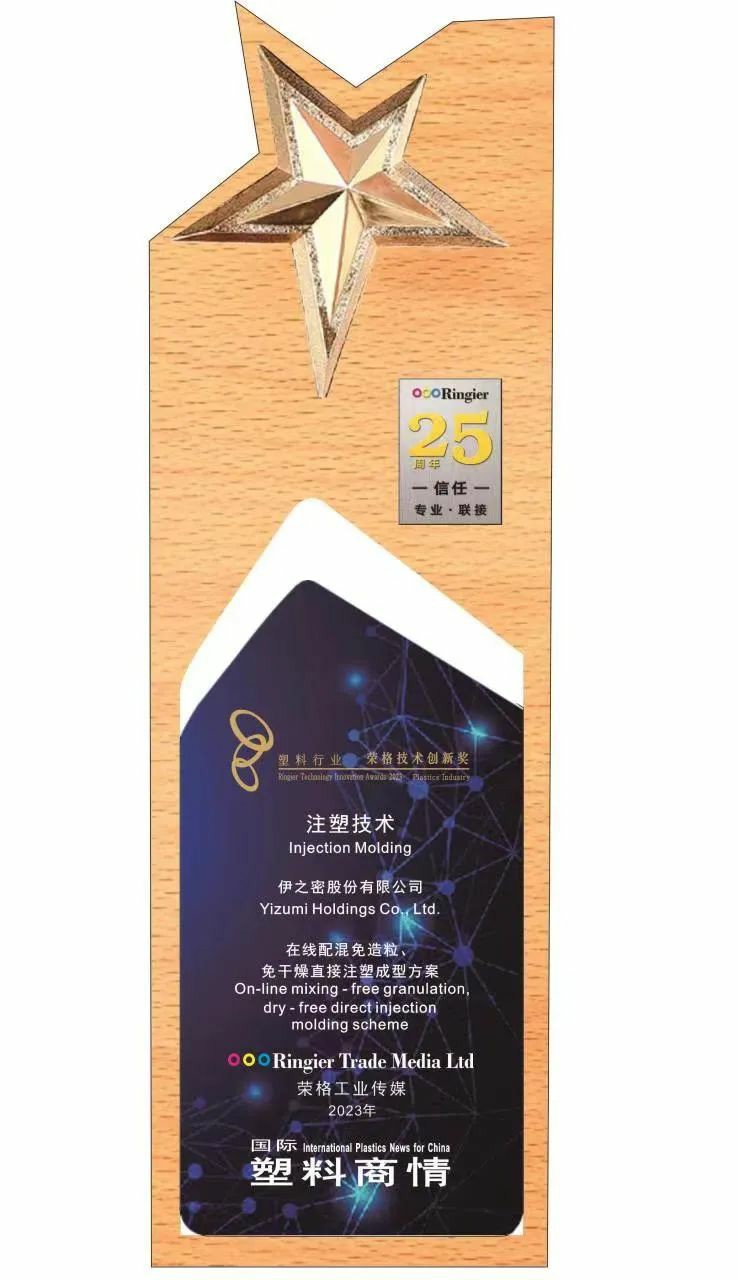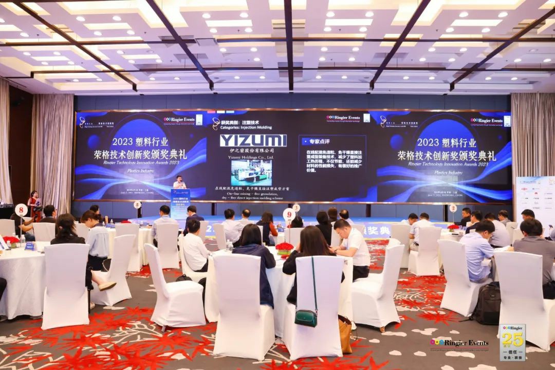 伊之密股份有限公司憑借在線配混免造粒、免干燥直接注塑成型方案榮獲“2023塑料行業-榮格技術創新獎”,并應邀出席此次行業盛典。