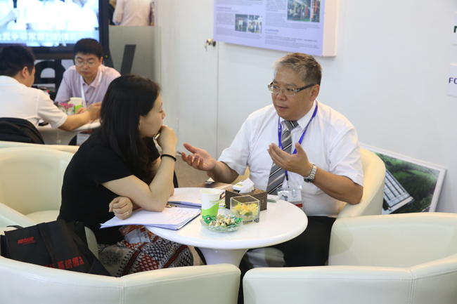 圖釋:伊之密董事總經(jīng)理甄榮輝(右)在廣州雅式展上接受《現(xiàn)代塑料工業(yè)》采訪