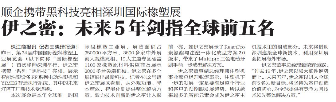 珠江商報訊 記者王曉琦報道:昨日,第34屆中國國際塑料橡塑工業(yè)展覽會(以下簡稱“國際橡塑展”)首次移師深圳舉行,伊之密攜帶一系列“黑科技”亮相,展示智能注塑設(shè)備FF系列電動注塑機和YiMES智造執(zhí)行系統(tǒng),其中的未來燈塔工廠新技術(shù)受追捧。