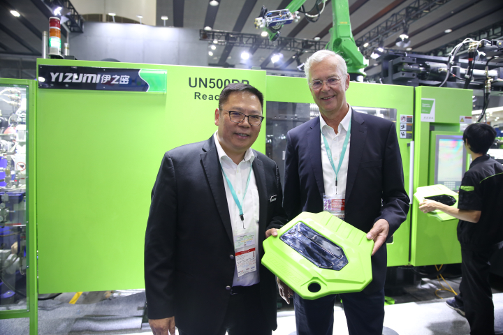 ▲今年5月,ReactPro聚氨酯模內噴涂方案亮相“2019中國國際橡塑展”。圖為伊之密董事總經理甄榮輝(左)和伊之密首席戰略官Dr. Hans Wobbe(右)展示方案制品。/企業供圖