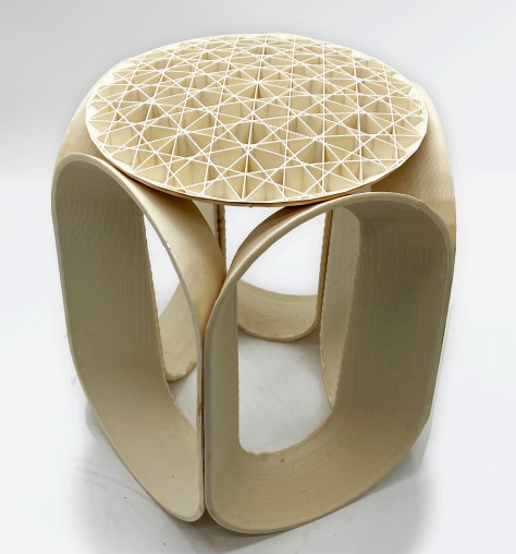 「花鼓新傳」系列桌凳同源中式五足家具,以更具變化的環形曲面,借拱形的支撐強度,呈現抽象干練的造型,以突出座面數字生成裝飾風格的千變萬化,超以象外,得之環中。
