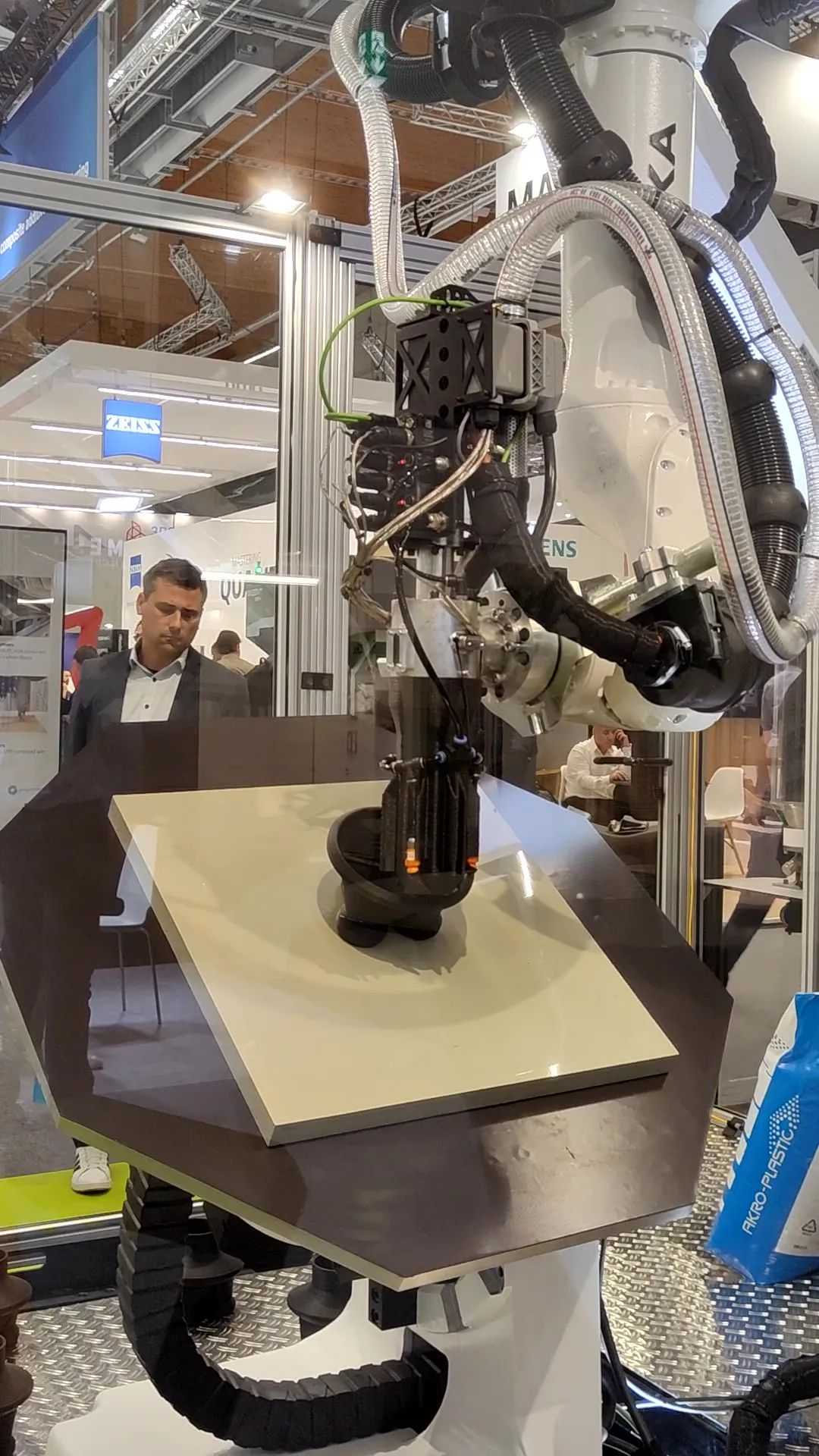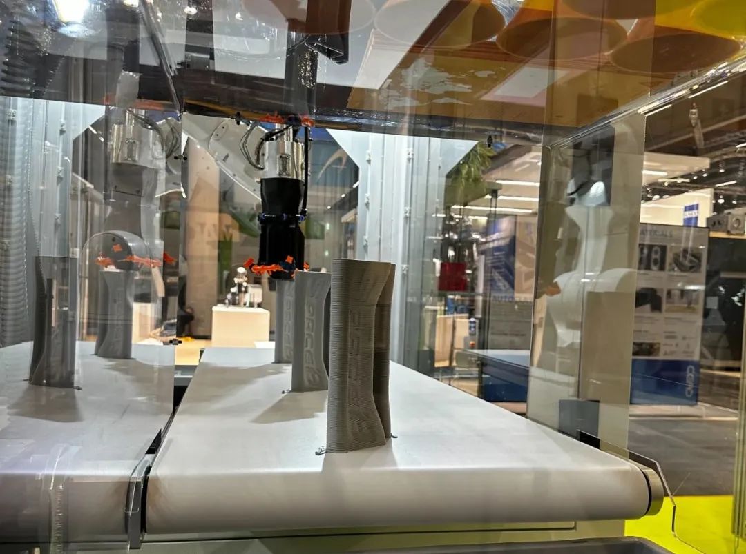 在本次參展的SpaceA C-Line定制系列展機中,其核心設備是一臺2500 KUKA機器人,其構建平臺上額外增加了兩軸,使其能夠實現更靈活的平臺轉動和傾斜。這種獨特的設計不僅允許更為復雜的組件設計,還能夠滿足按需生產的需求,同時還能節省材料。與此同時, SpaceA C-Line系列提供了廣泛的解決方案,為客戶提供了多樣化的選擇,以滿足不同行業和項目的需求。