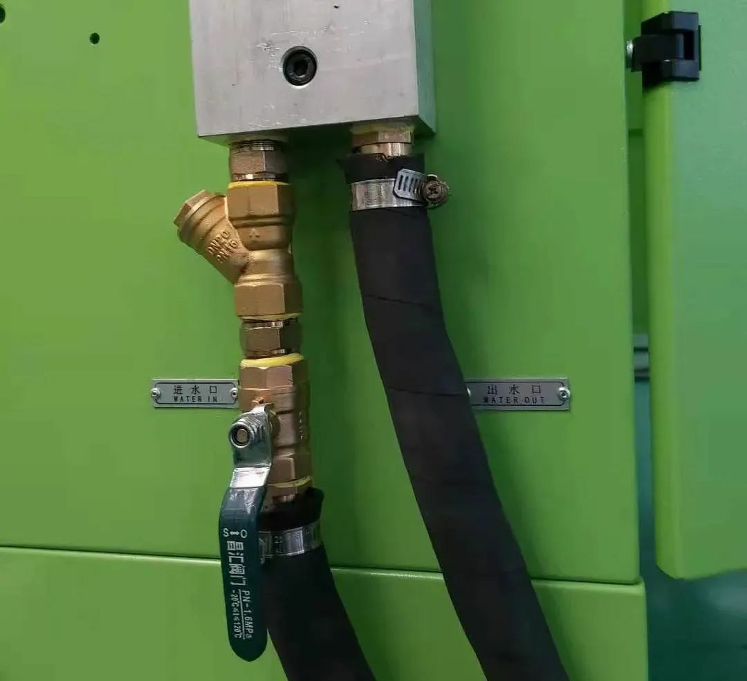 A、關(guān)閉注射/塑化/噴嘴體冷卻水的進(jìn)出水閥門,拆下進(jìn)出水管,如果環(huán)境溫度低于零度,需用風(fēng)槍將冷卻器內(nèi)部的殘留水分全部吹出來(此時(shí)需要保證控水電磁閥得電),避免冷卻器內(nèi)部水結(jié)冰導(dǎo)致冷卻器損壞,或者出現(xiàn)生銹或氧化。