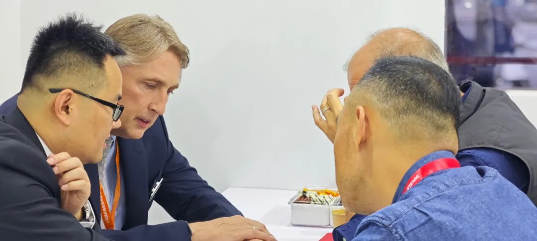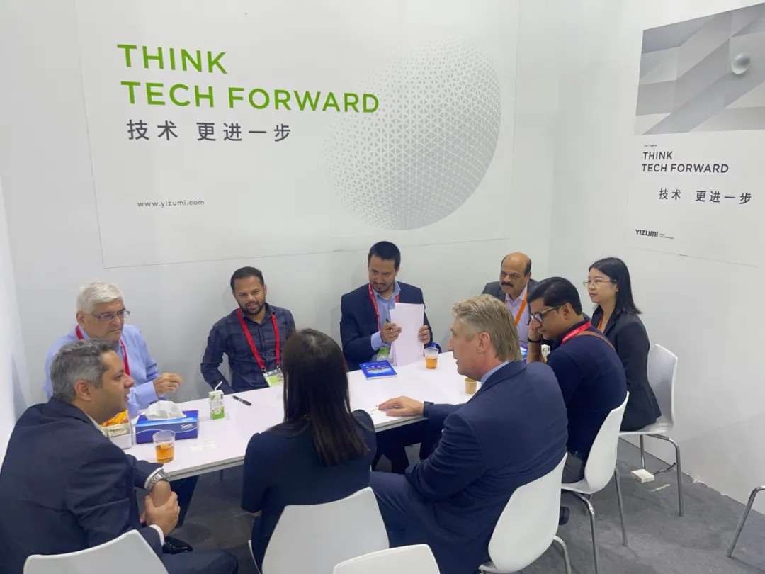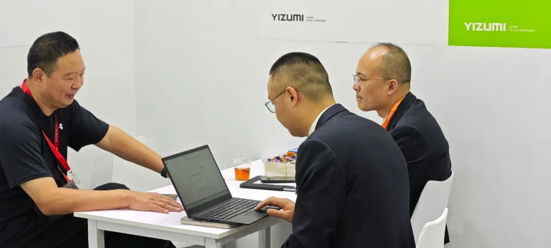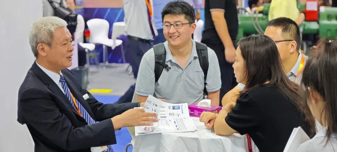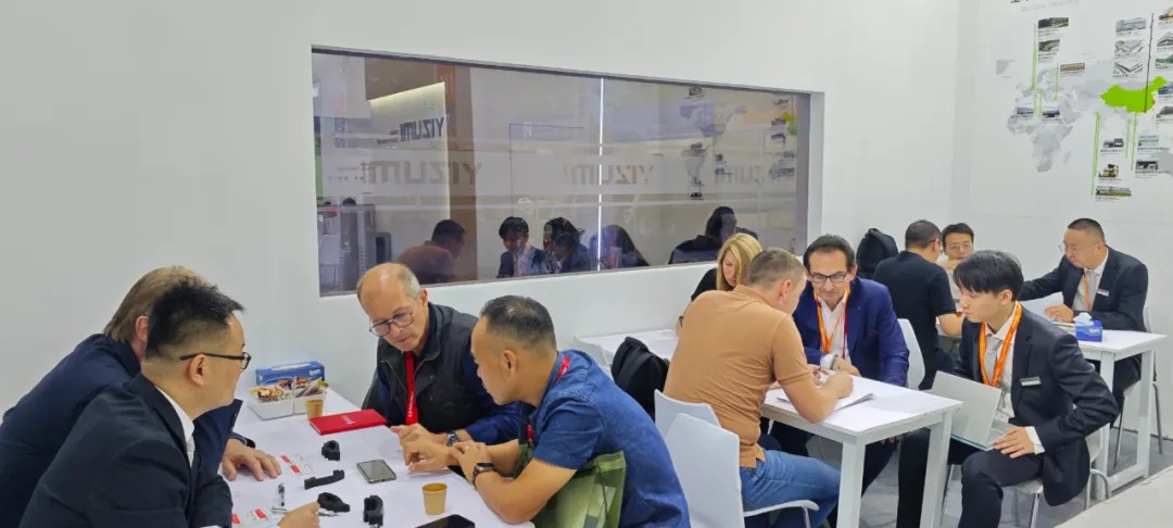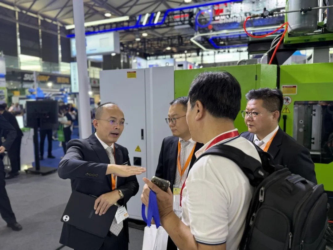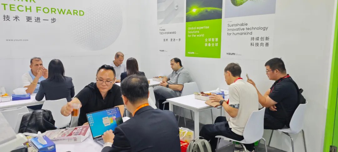開展首日,伊之密橡膠機展位就像一個充滿魔力的磁場,始終被專業觀眾包圍。洽談區內,大批采購商們圍坐在一起,圍繞設備定制化升級、智能化產線整合等議題展開深入的討論。
