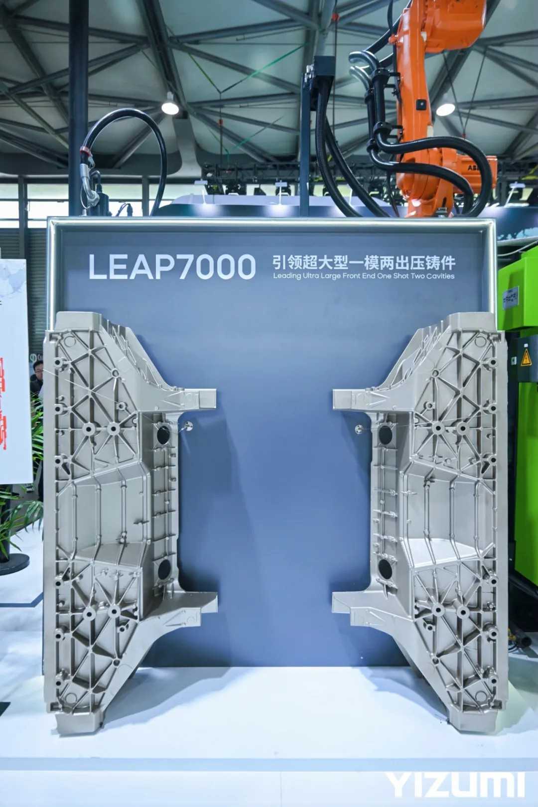 在此次上海壓鑄展上,伊之密展出了多款制品。其中,一模兩出前艙尤為引人注目。該產品的尺寸為700 x380 x1510毫米,單個重量為34.5公斤,是由LEAP7000超大型壓鑄機壓射而成。該設備采用了創新性的模具澆口設計,使得生產節拍能夠控制在130秒以內,顯著提升了生產效率。此外,其精確的壓射控制能力確保了左右兩件搭接面尺寸偏差控制在±0.5mm以內,尺寸合格率達到98%以上,充分驗證了LEAP 系列壓鑄機完全有能力滿足新能源汽車大型一體化壓鑄結構件極為苛刻的需求。