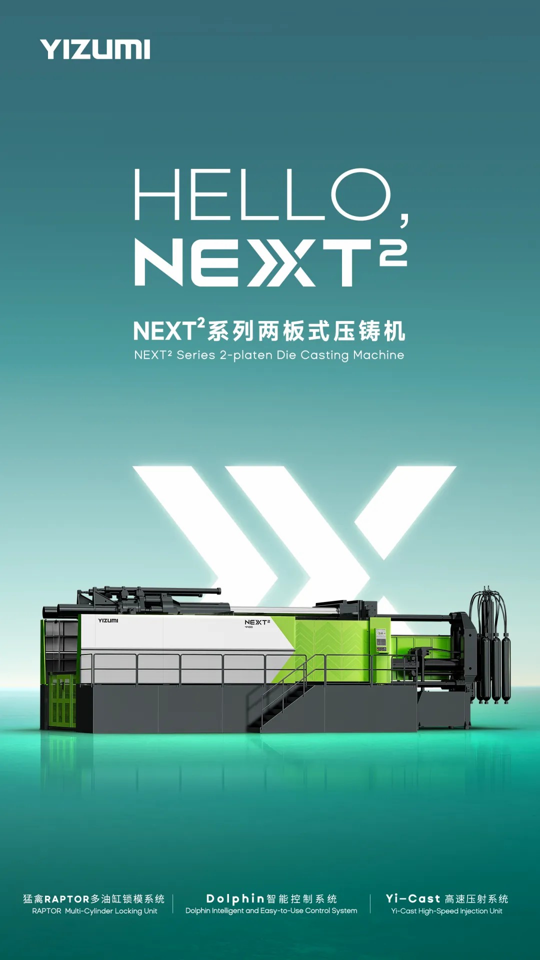 伊之密NEXT2兩板式壓鑄機,其名寓意深遠。“NEXT”一詞,英文意為“下一個”,它象征著公司對于技術創新和產品升級的堅定追求,以及引領行業發展的遠大愿景;而“2”(即2次方)不僅蘊含了兩板機的含義,還代表著技術、性能的倍增與全面提升,寓意著這款機器在多個方面都實現了革新與突破。
