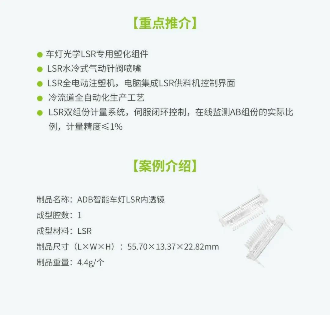 作為一家裝備制造企業,伊之密緊緊抓住這個機遇,結合上海當地產業特色和客戶需求,著眼大局精準謀劃。此次在汽車應用領域上,伊之密重點展示了ADB智能車燈LSR光學內透鏡全自動化成型整體解決方案。