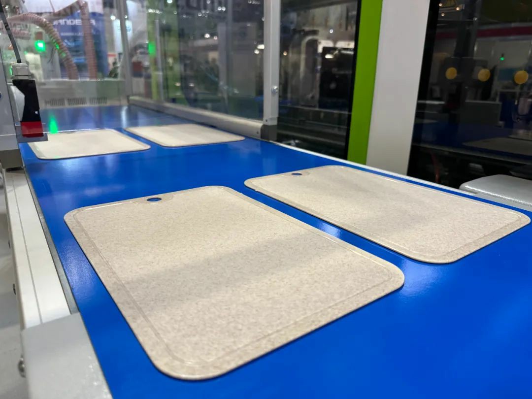 展會上,伊之密(展位號:3A-GG10)運用UN220A5-EU搭配機械手YR1000S3,現場生產菜板。其中,木塑材料菜板成型方案采用木塑專用塑化組件,生產菜板等日用品,節約塑料用量,實現廢物再生利用,實現低碳綠色生產。