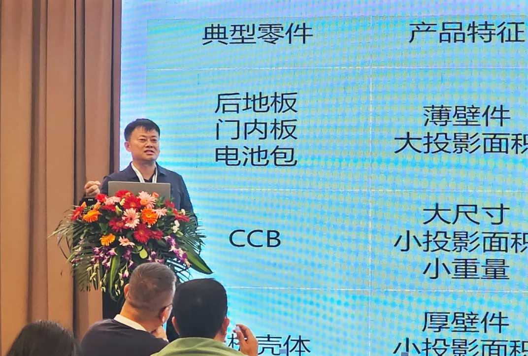 展會期間,伊之密鎂合金半固態(tài)注射成型市場經(jīng)理陳勇先生作了題為《廉鎂時代下的半固態(tài)鎂合金注射成型》的分享,深入解讀了鎂合金材料的優(yōu)勢、行業(yè)發(fā)展趨勢及伊之密的核心技術(shù)突破,引發(fā)與會者的廣泛關(guān)注。陳勇提到:早在 2009年,伊之密已啟動半固態(tài)鎂合金注射成型項目,經(jīng)過多年的技術(shù)研發(fā)和創(chuàng)新,已成功打破國外壟斷,實現(xiàn)了半固態(tài)鎂合金注射成型裝備的國產(chǎn)化。目前,伊之密的半固態(tài)鎂合金注射成型裝備已達到國際先進水平。伊之密不僅在設(shè)備研發(fā)制造方面取得了突破,還構(gòu)建了半固態(tài)鎂合金產(chǎn)品開發(fā)的技術(shù)體系,提供從材料數(shù)據(jù),力學(xué)、模流仿真,模具設(shè)計制作,樣件制作等一站式服務(wù),使復(fù)雜件、大型件的開發(fā)高效落地,從而大幅降低了開發(fā)難度。