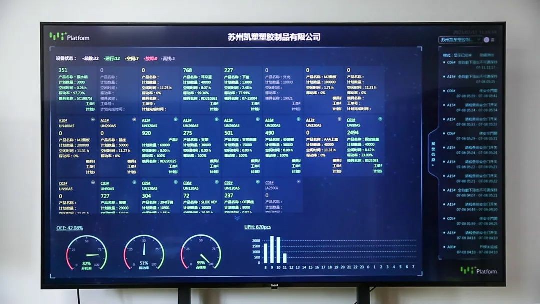 2023年3月,凱塑正式上線伊之密Yi MES制造執行系統。該系統可以智能監控設備狀態,并自動采集數據,從而幫助企業構建生產過程執行系統,實現生產狀態實時跟蹤、生產異常預警提示和全程可追溯等功能。