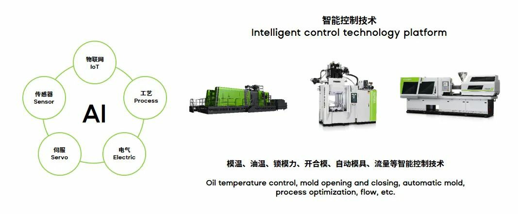 首先,在智能控制技術領域,用AI的算法全面給傳感器技術、伺服控制技術以及物聯網通訊技術賦能,特別是在模具、溫度、油的溫度、自動化模具,以及流量控制等智能控制技術領域,給設備插上智能化的翅膀,讓設備真正升級為智能化的設備。