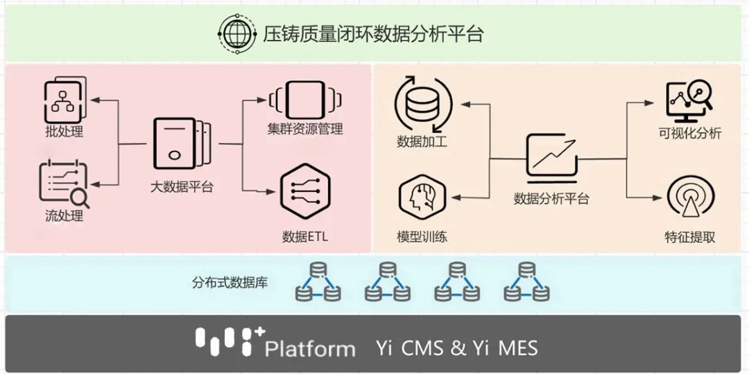 在設(shè)備聯(lián)網(wǎng)和生產(chǎn)信息化的基礎(chǔ)上,智慧鑄造解決方案進一步構(gòu)建了壓鑄質(zhì)量閉環(huán)數(shù)據(jù)分析平臺。該平臺以大數(shù)據(jù)技術(shù)為核心,通過整合Yi CMS、Yi MES等系統(tǒng)的數(shù)據(jù)資源,高效完成工藝大數(shù)據(jù)的清洗、加工及特征提取工作。在此基礎(chǔ)上,我們構(gòu)建了工藝過程的數(shù)字化模型和數(shù)據(jù)分析工具,為工藝優(yōu)化和質(zhì)量控制提供了強有力的數(shù)據(jù)支撐。